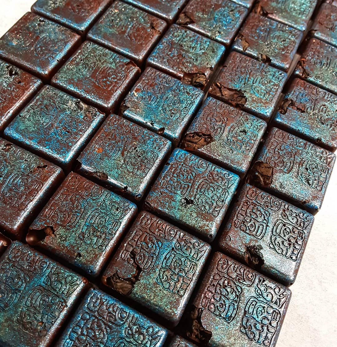 AS WE WALK: Aged Tung Ting tea dust brown sugar dust ganache in Guatemalan dark chocolate. The inside is a powdered ganache that liquifies in your mouth.