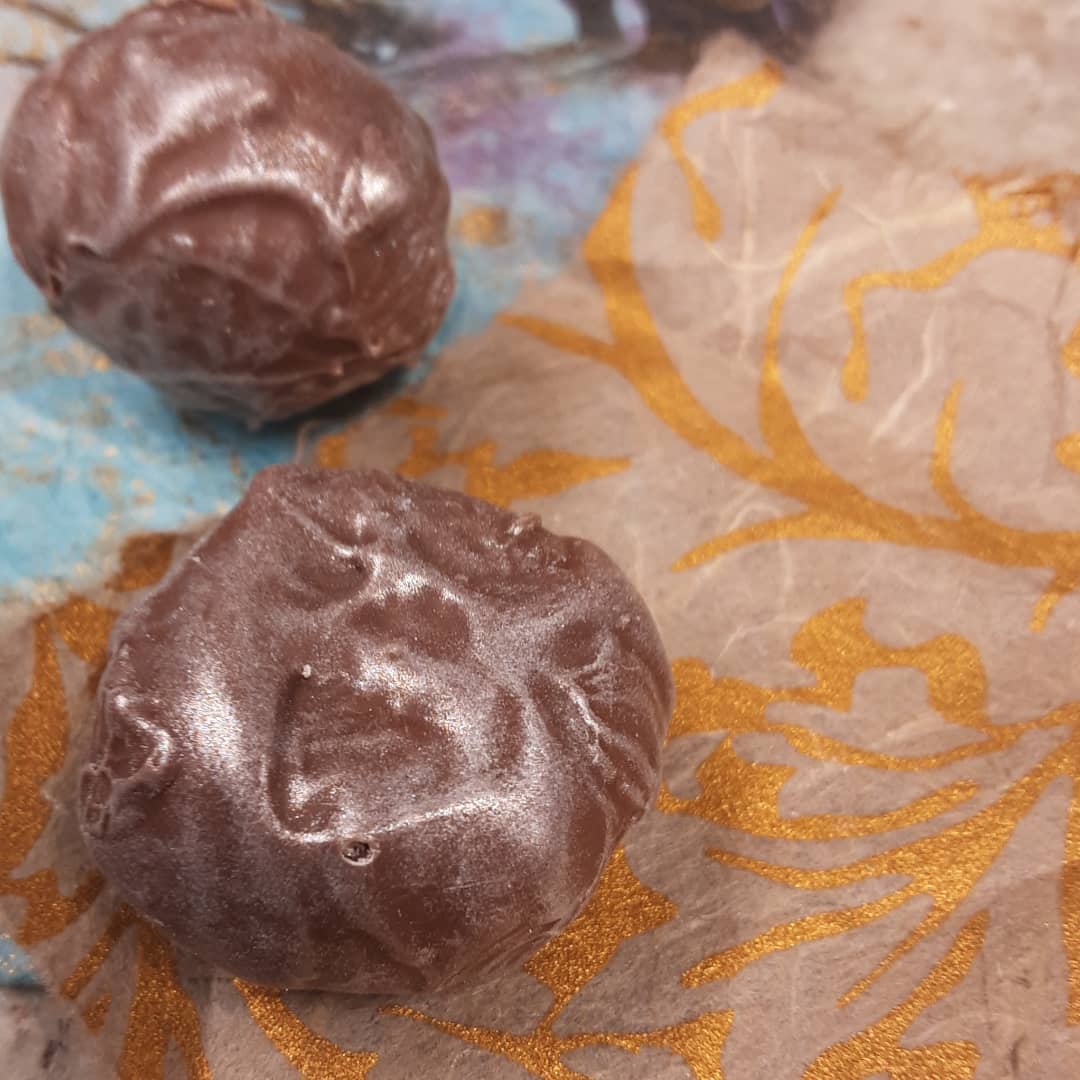 AT A CAFE TABLE: dark chocolate coffee ganache in a malty milk shell