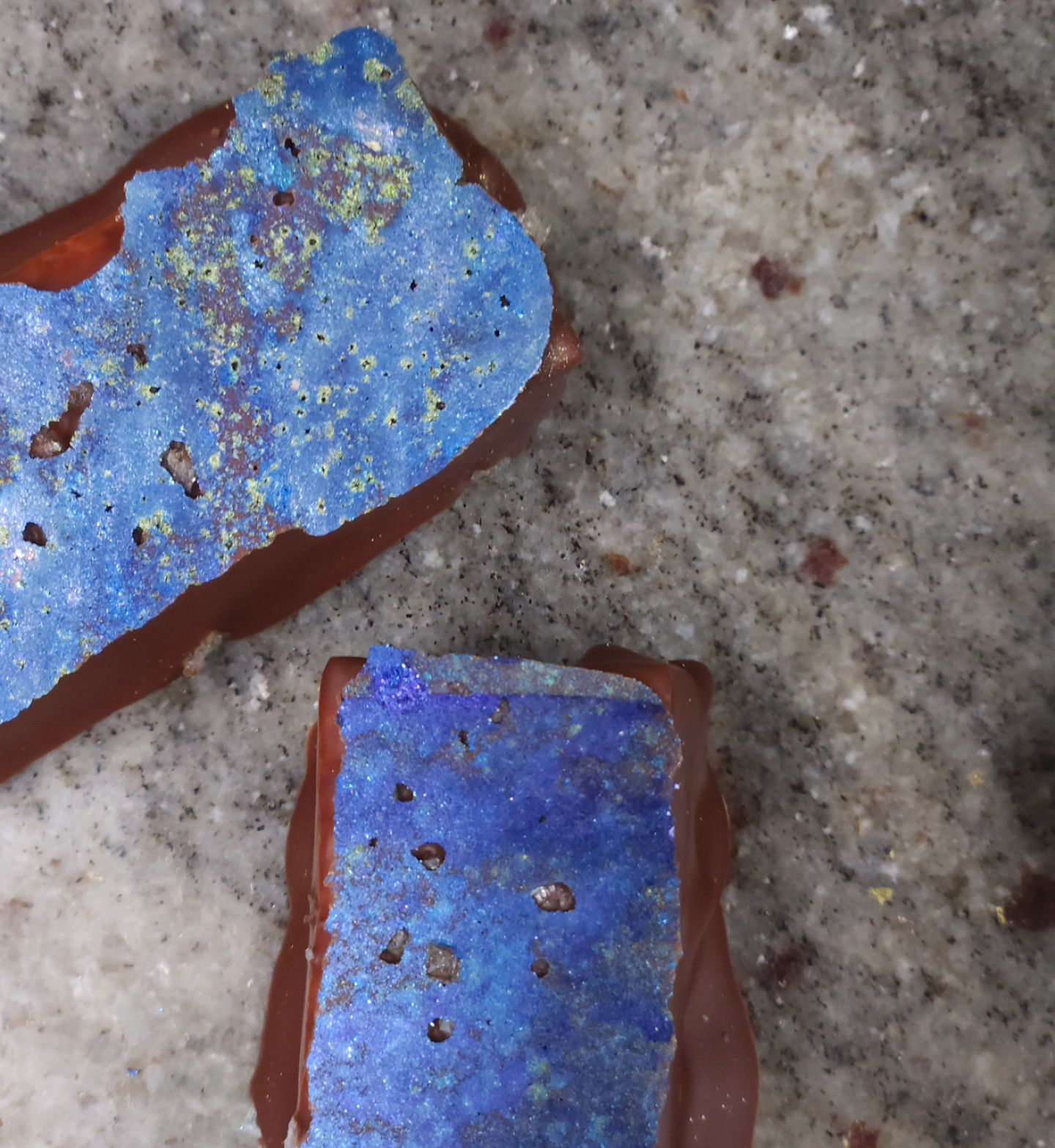 Candy Bar July 29, 2023August 1, 2023What's In My Box BALANCING CONTRAST: Lavender marshmallow over dark ganache dipped in dark milk chocolate. One dusted with salt, the other with candied lavender. #chocolatier #candybar #chocolateasart