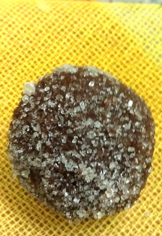 Truffle of Axiom dark chocolate & lemon balm ganache enrobed in Tango dark chocolate and lemon-infused sugar.