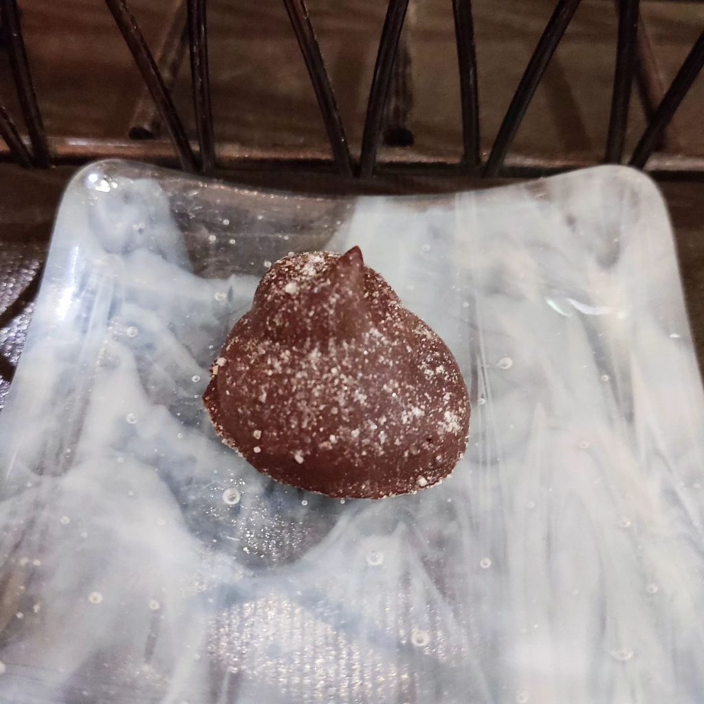 Wait Your Churn • Balsamico and sweet plum butter ganache finished in a mix of Belize Criollo 70% and Vietnam Lam Dong 70% dark chocolates with powdered candied fig dusted on top