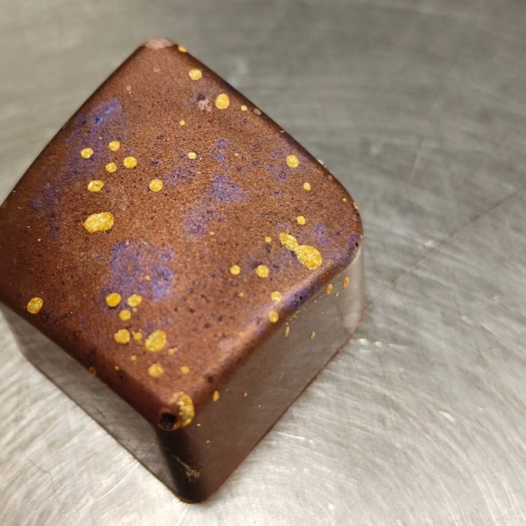 Bananas – local honey & local cider stabilized with Ghana dark chocolate layered over caramelized red banana.Cast in Vietnam Ben Tre 70% dark.