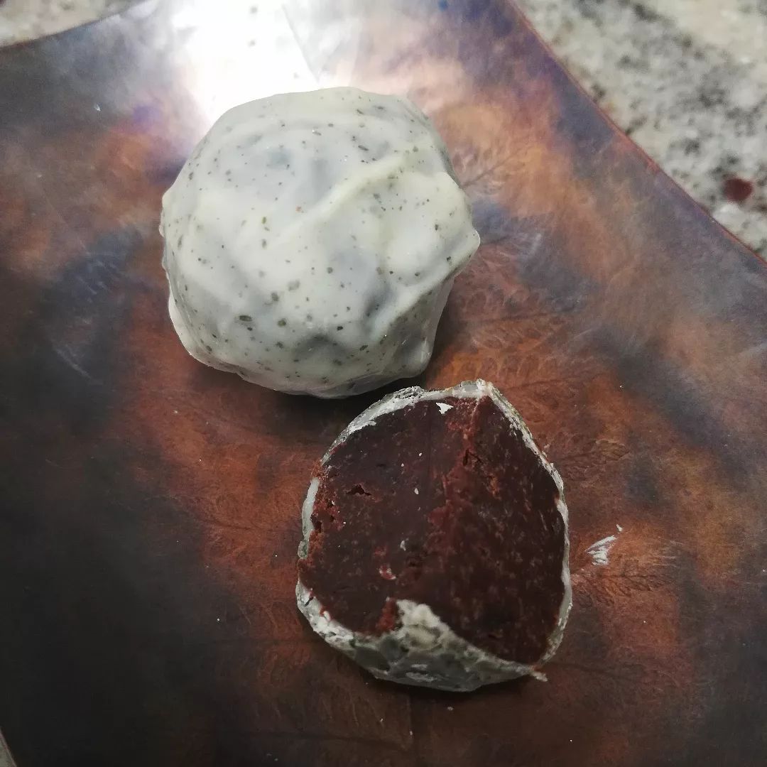 Japanese Sweet Black Bean March 14, 2023March 14, 2023What's In My Box BEEN THERE, NAILED IT – Japanese black bean ganache truffle enrobed in Peppermint & tea infused white chocolate. No nails. Shop for Chocolate