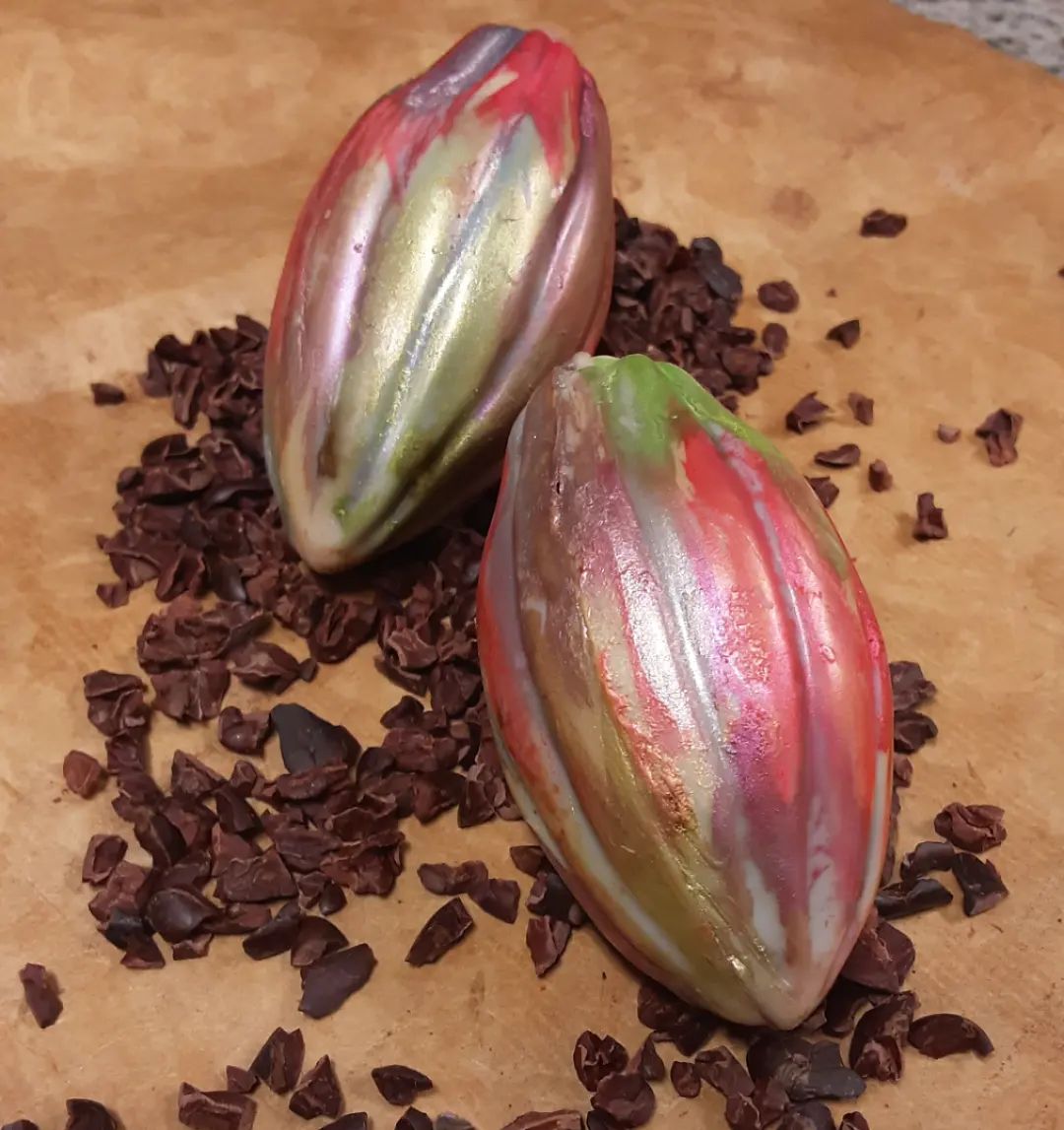Large Cacao Pod November 11, 2022November 11, 2022What's In My Box COLORFUL CACAO POD: apricot marshmallow layered inside pumpkin seed praliné with almond and Mexico Almendra Blanca dark chocolate, cast in a white and dark shell #chocolatier #pumpkin #cacaopod
