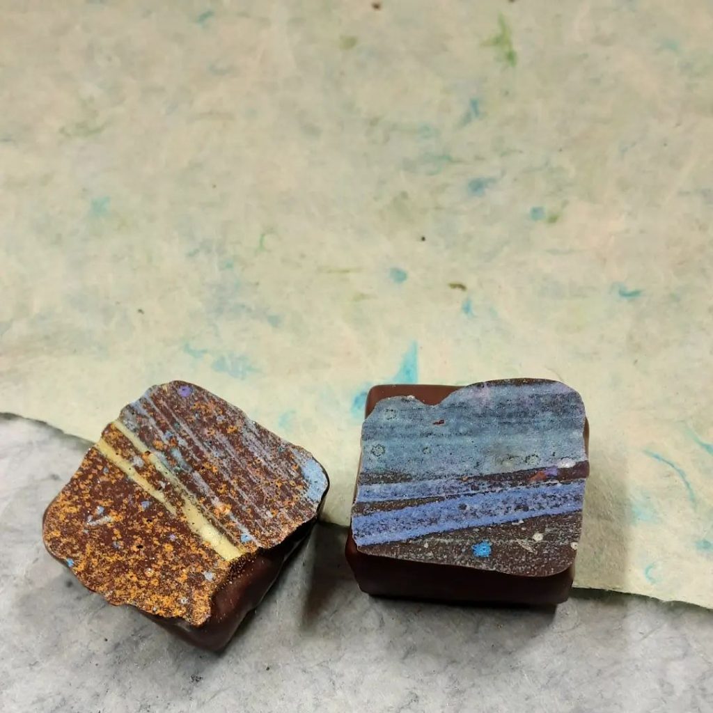 Calamonda or Apricot with Montagne Bleue Tea December 13, 2022December 13, 2022What's In My Box A METAPHOR OR SOMETHING: left– Mom Lowy’s Calamonda citrus and fruity black tea ganacheright– apricot and the same tea in milk chocolateParing fruit and tea, creation simultaneously. Things linked through similarity, and made metaphorically