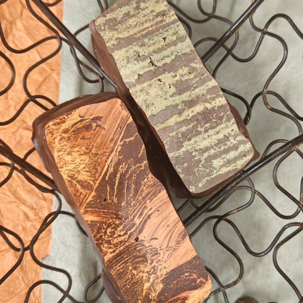 EARTH GODS. Red plum cloud caramel over stone fruit nougat–pears, nectarines, and apricots. The GREEN candybar is sprinkled with baharat Persian spices and dipped in Bolivia Alto Beni Heirloom 60% dark milk chocolate, the ORANGE is sprinkled with saffron threads and dipped in a blend of dark chocolates.