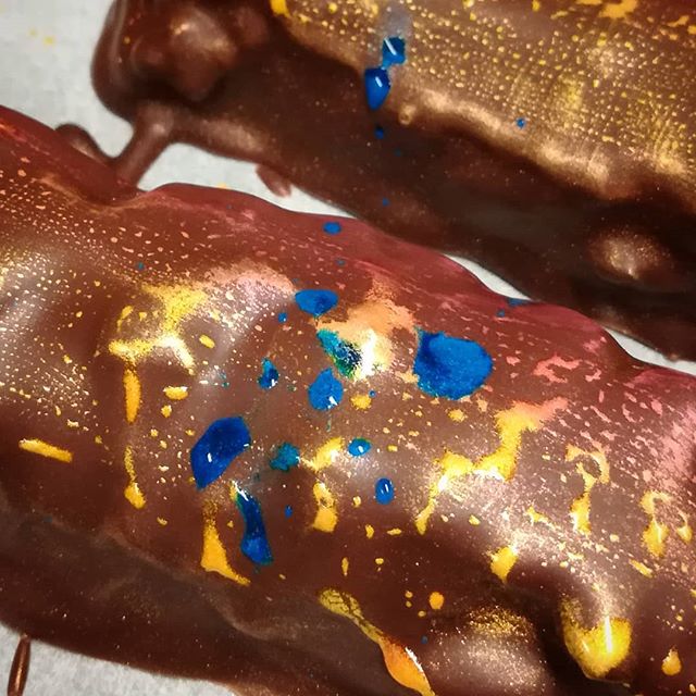 Candy Bar July 17, 2019January 11, 2020What's In My Box “Jackson Pollacking” these candy bars, so they’re both delicious and beautiful. They’re apricot cranberry nougat with candied almonds and Hennessey ganache. #chocolatier #chocolateasart #artist #jacksonpollack #candybar