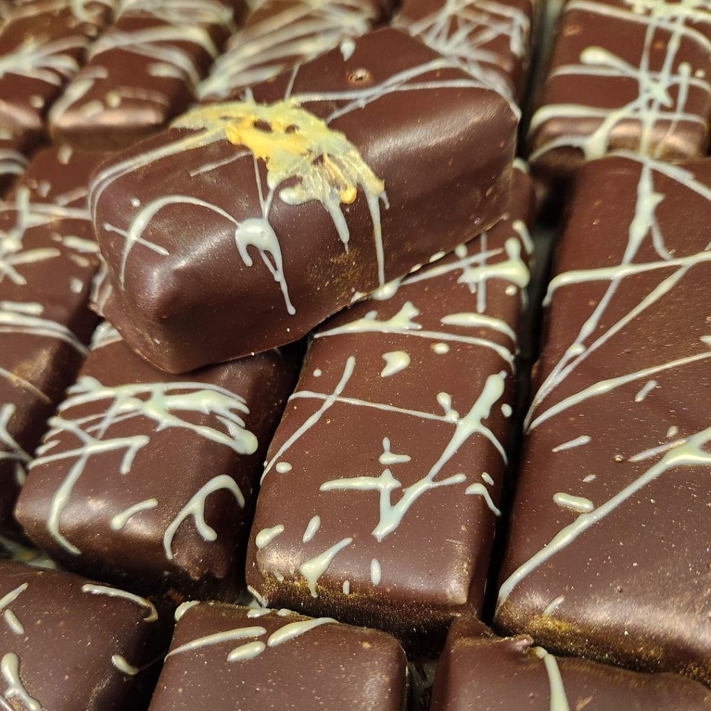 Music Box • Cherry paté de fruit with dried pear and apricots along with a fig ganache finished in Ghana dark chocolate with a bit of white chocolate on top. The cherry is vibrant, the fig full and rich.