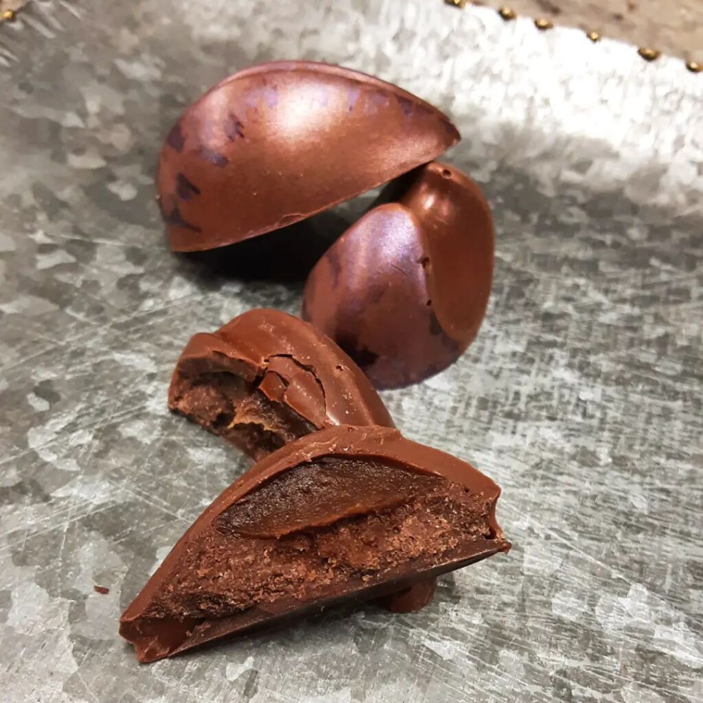 IN OUR POCKETS: chile cloud caramel and cashew gianduja in a housemade Brazilian dark milk chocolate. #chocolatier #pockettreasures #layers In our pockets, marvelous things, little bits and forgotten moments, in our pockets, small pieces, collecting up our treasures