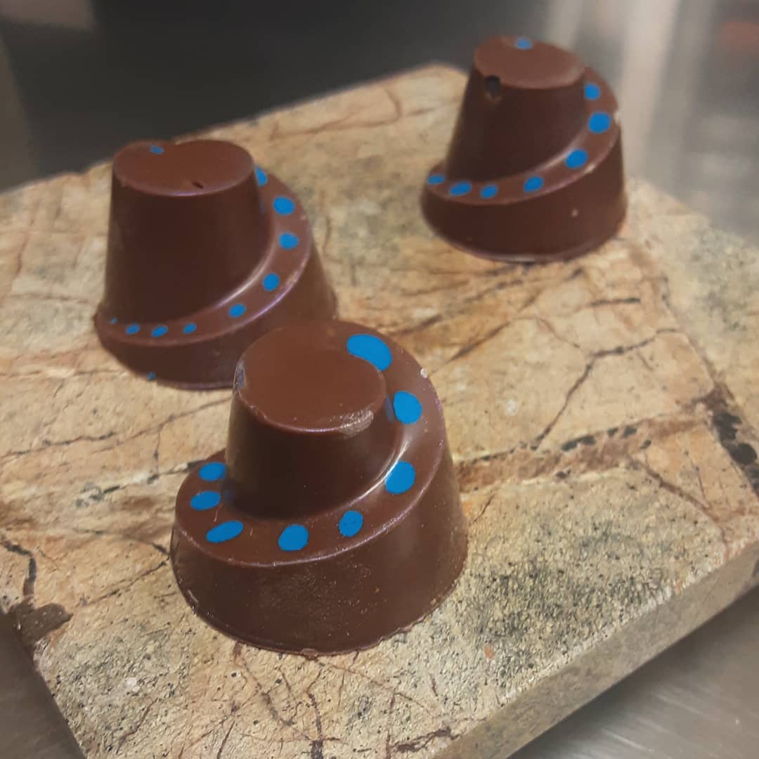 COMFORTS REARRANGED: A layer of blueberry over fudgy dark chocolate ganache in a sweet milk chocolate shell with lavender and black cardamom.