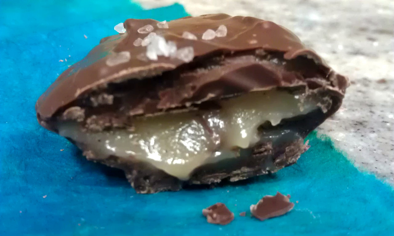 Sweet creamy caramel with Hawaiian sea salt in Kenshi 70% Dark Milk chocolate.