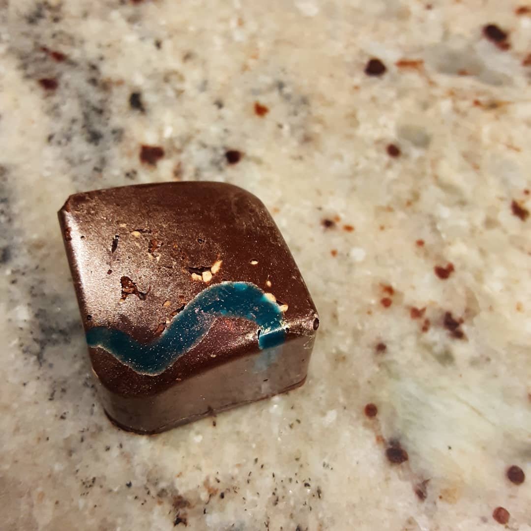 Snaked blue and purposeful imperfections enclose tangy chocolates and spices.
