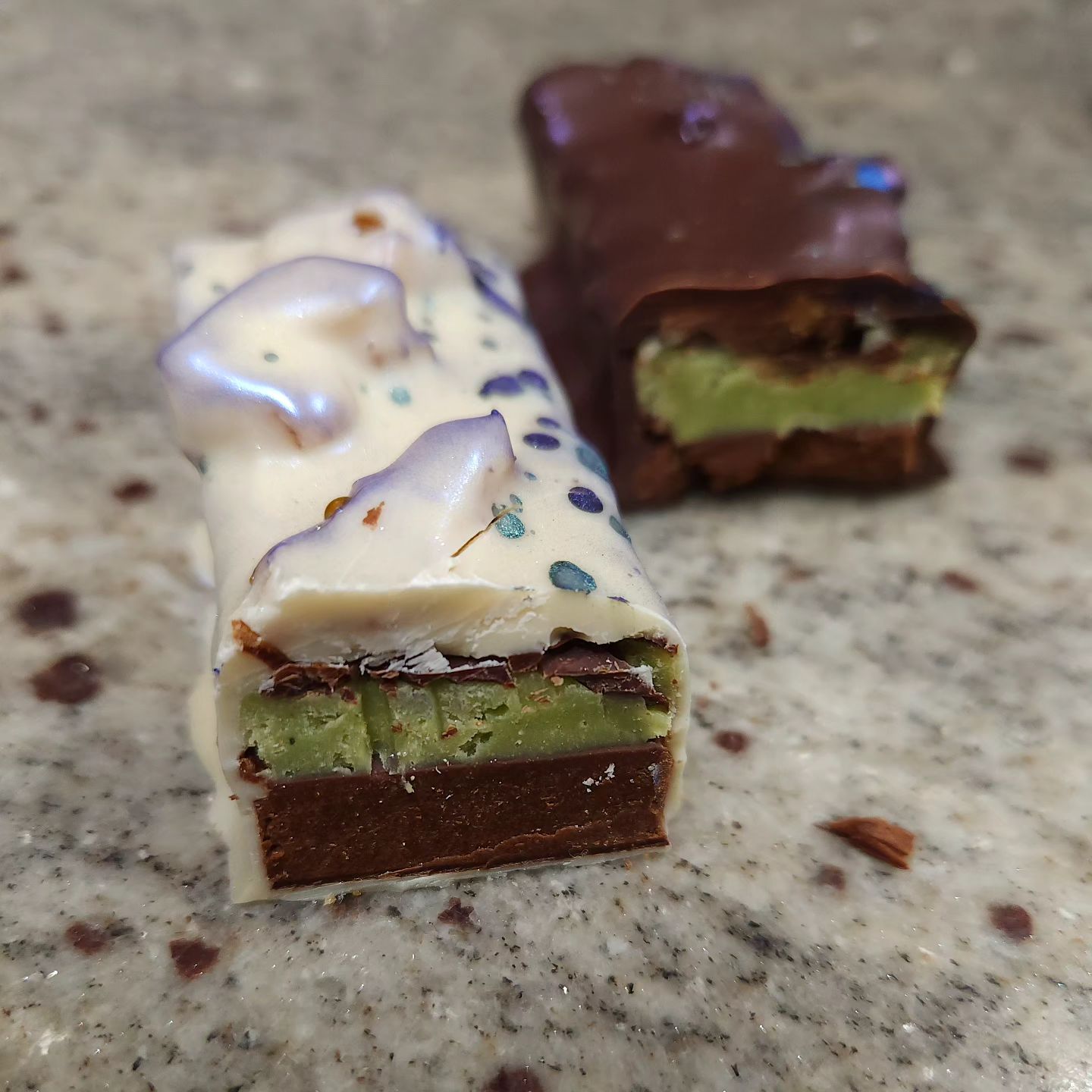 DAYS VARIATIONS: a double layer of matcha ganache, one in white one in dark. A candy bar, one in white one in dark. Candied macadamia all around.