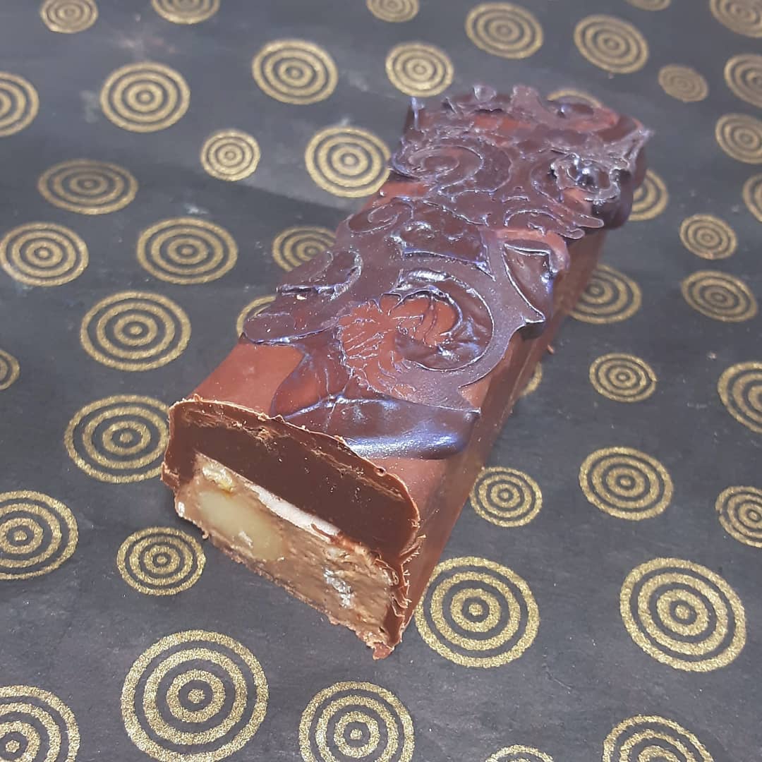 DREAMS OF TEA PARTIES: Macadamia praliné over macadamia blood orange nougat in nutty milk chocolate.
