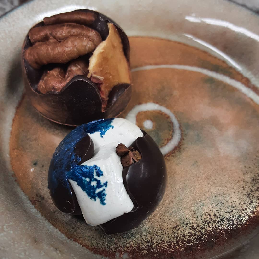 A Pair of Solid Clusters May 20, 2021May 20, 2021What's In My Box UPPER: Dried peach and pecan cluster with Equador dark chocolate; LOWER: Vanilla Nougat and Imperial Sichuan Peppercorn in Equador dark chocolate #chocolatier #cluster #driedfruit Shop for Chocolate