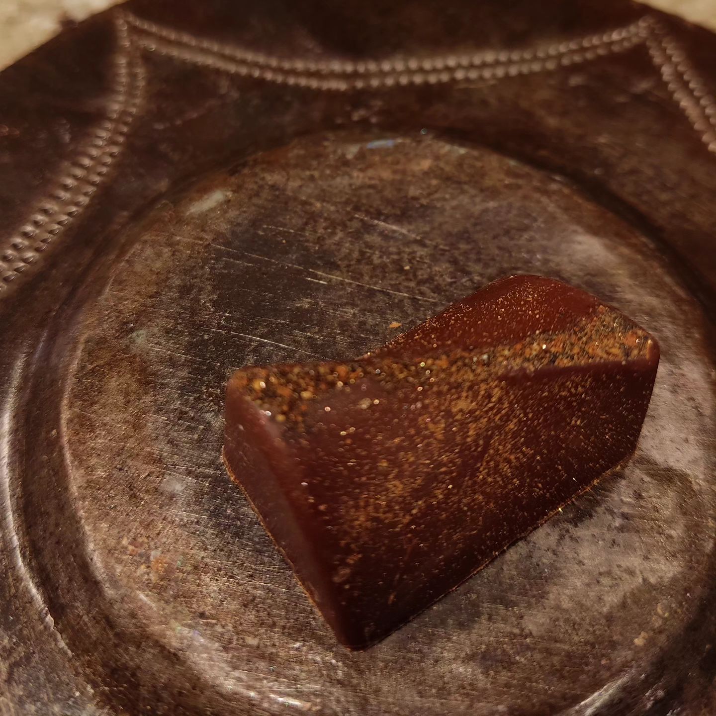 Walnut Chai September 6, 2023September 6, 2023What's In My Box DUST DUET – walnut gianduja layered over dark Ghana ganache, finished with a stripe of house-made Chai spice. #chocolatier #chai May contain lots of walnuts.