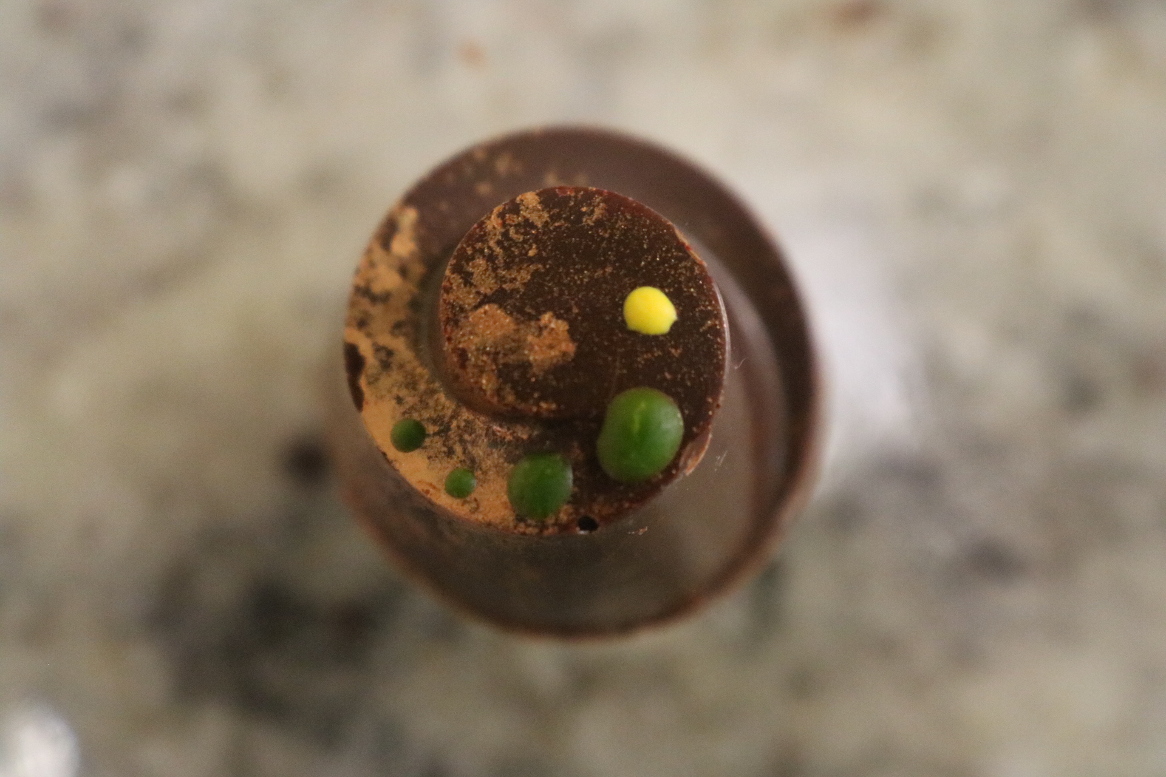 Key lime, milk chocolate and cocoa butter enclosed in a tower in Tango 67% dark chocolate
