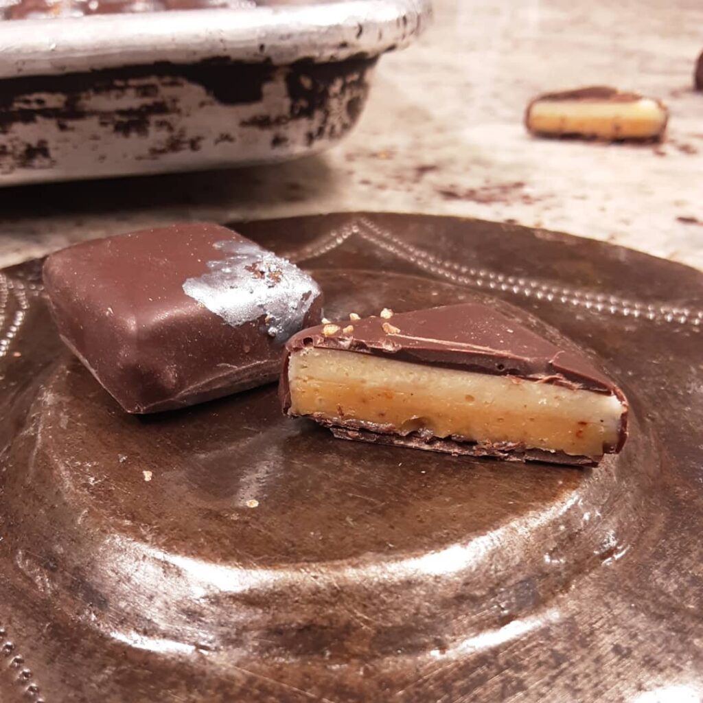 Etrog Citron with Chiles July 28, 2021July 28, 2021What's In My Box AMUSINGLY SPICED: a layer of Etrog Citron & Hawks Claw chile ganache over chile spiced ganache and finished with Kampot peppercorn.(not terribly spicy) #chocolatier #citrus #chiles heat is creeping amusingly, as hilarious as spices can be Donate to HCP Help Chocolate Save the World.