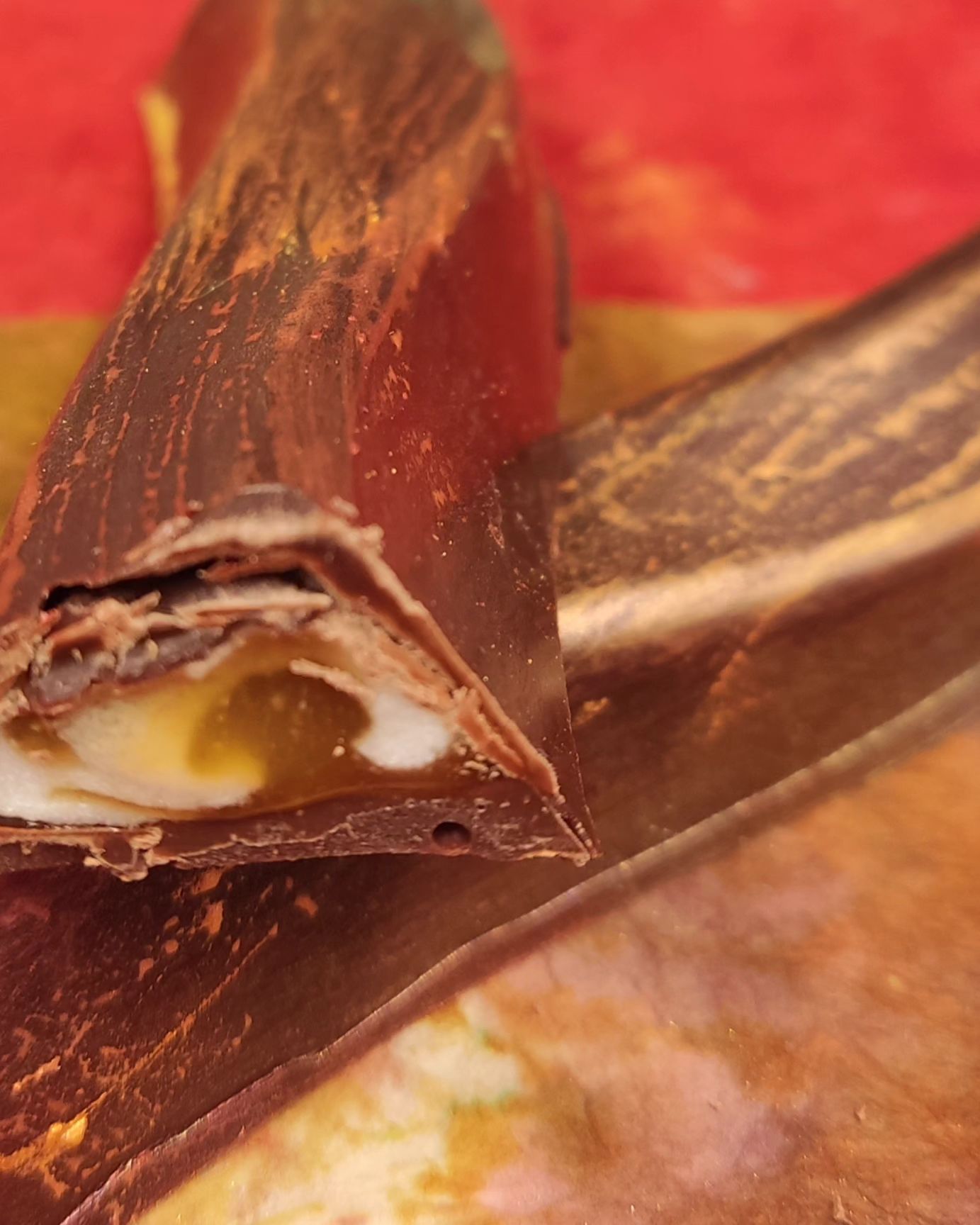 FIREWALKER – Ghost chile caramel encircled by chrysanthemum marshmallow, cast in Mexico Soconusco 70% dark chocolate.