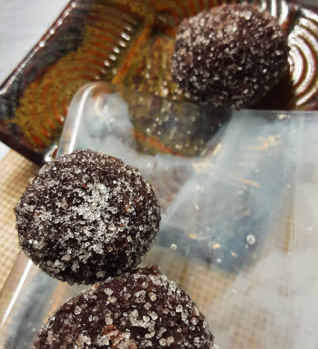 FOR THE SAND: Heirloom Nicaraguan truffle with a grain of black Cyprus salt surrounded by vanilla sugar.