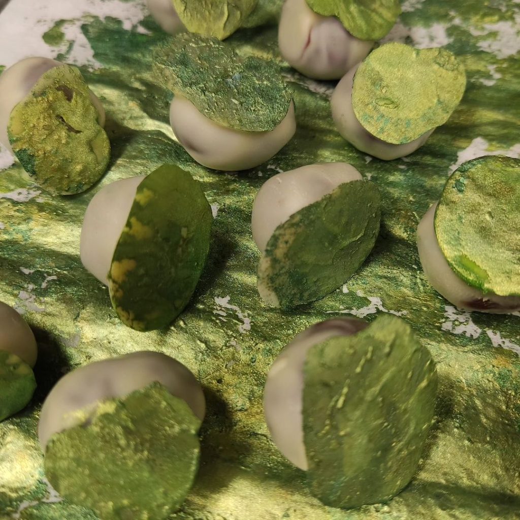 GREEN PATCHES - Fresh parsley and Wild Bolivia Itenez Heirloom dark milk chocolate truffle finished in Mexico white.
