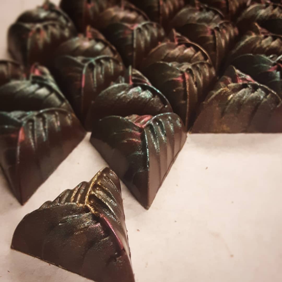 HARD EDGES – fresh cherry caramel with miel de cacao, coconut, and coffee cast in brilliantly fruity Tanzania dark chocolate. #chocolatier #beantobonbon #mieldecacao @meridiancacao#chocolatier #beantobonbon #mieldecacao @meridiancacao