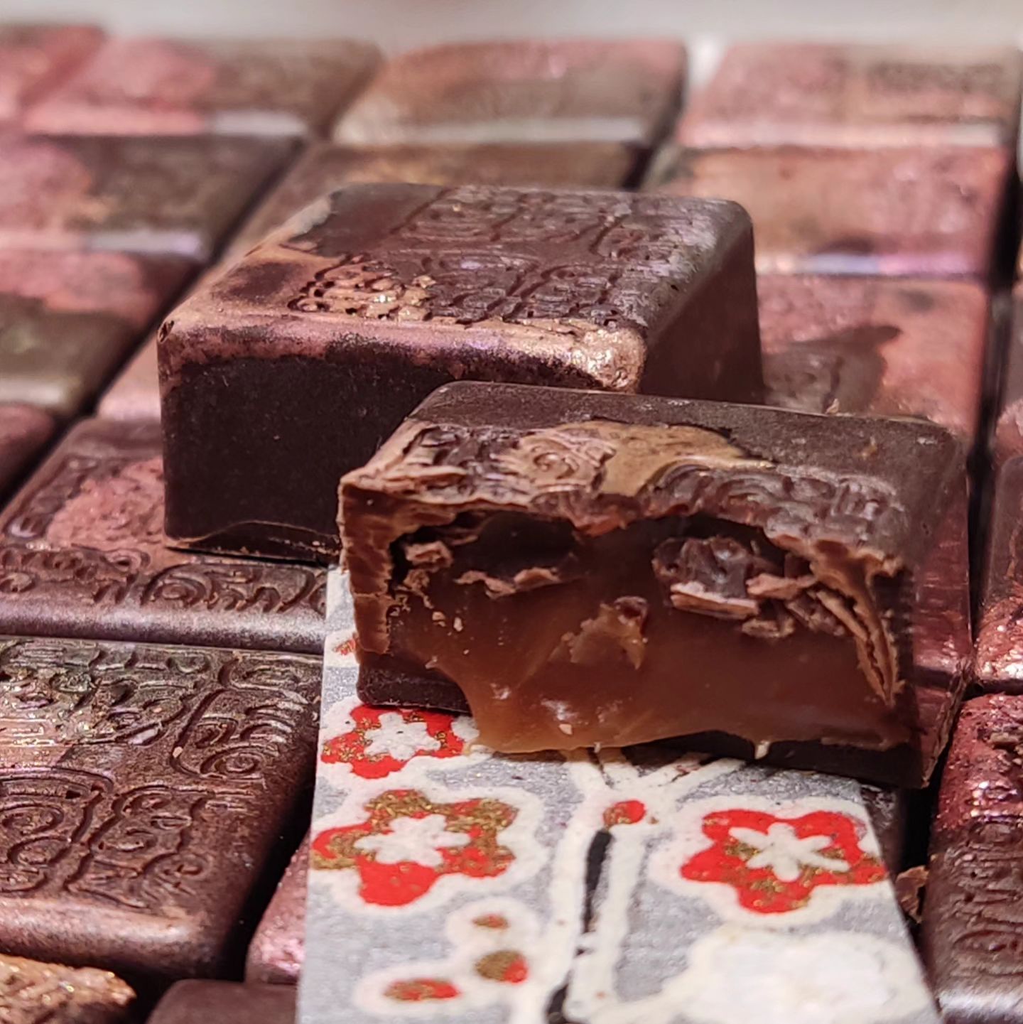 HERE NOR THERE – Hiroshima cherry blossom vinegar and cherry blossom salt cloud caramel with Wild Bolivia Heirloom Tranquilidad dark chocolate.