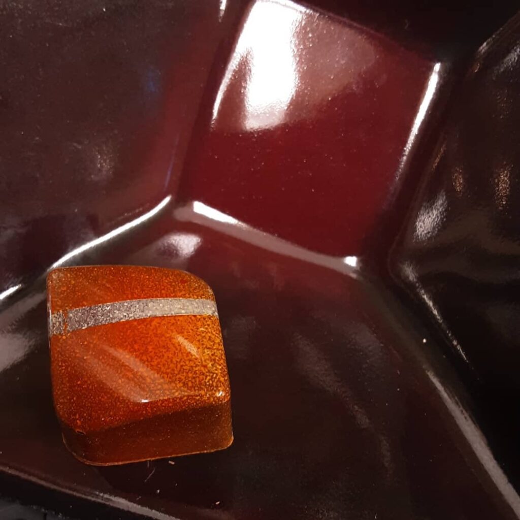 Honey Maple Chile July 28, 2021July 28, 2021What's In My Box THIS IS NOT AN ORANGE BONBON: maple honey chile ganache in tangy dark milk chocolate#chocolatier #maple #ganache an orange bonbon but yet its not one would we're stating the obvious but we're not. Donate to HCP Help Chocolate Save the World.