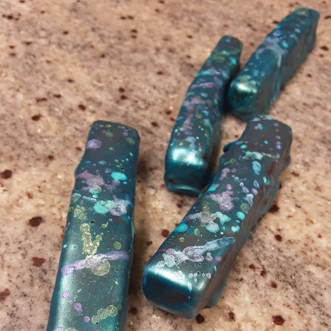 INSIDE OR OUT (A DIALOGUE ON MESSES) blueberry marshmallow and Belize dark chocolate cloud caramel enrobed in house-made Puerto Rican dark chocolate.