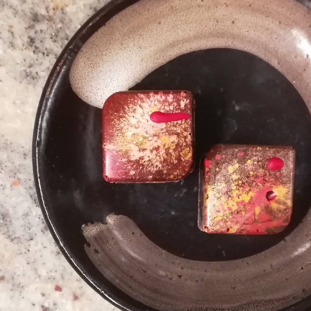 An experiment in flavor perception, the red line bonbon is raspberry over macadamia, while the red dot bonbon is macadamia over raspberry.