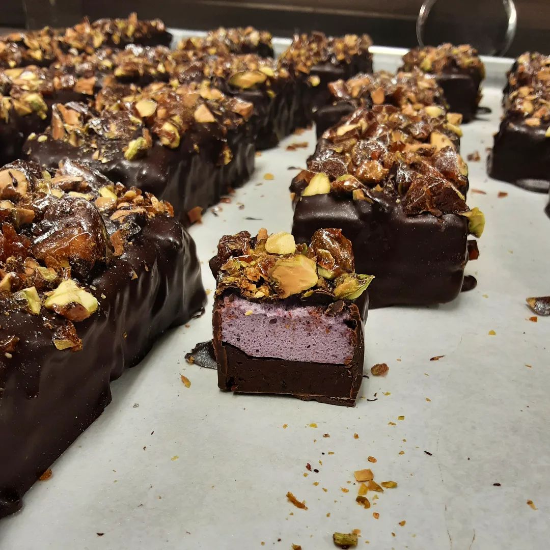 LAYERS OF GEOLOGY – a layer of blueberry brown sugar silk road spice cloud caramel under blueberry marshmallow enrobed in Ecuador dark and topped with candied pistachio