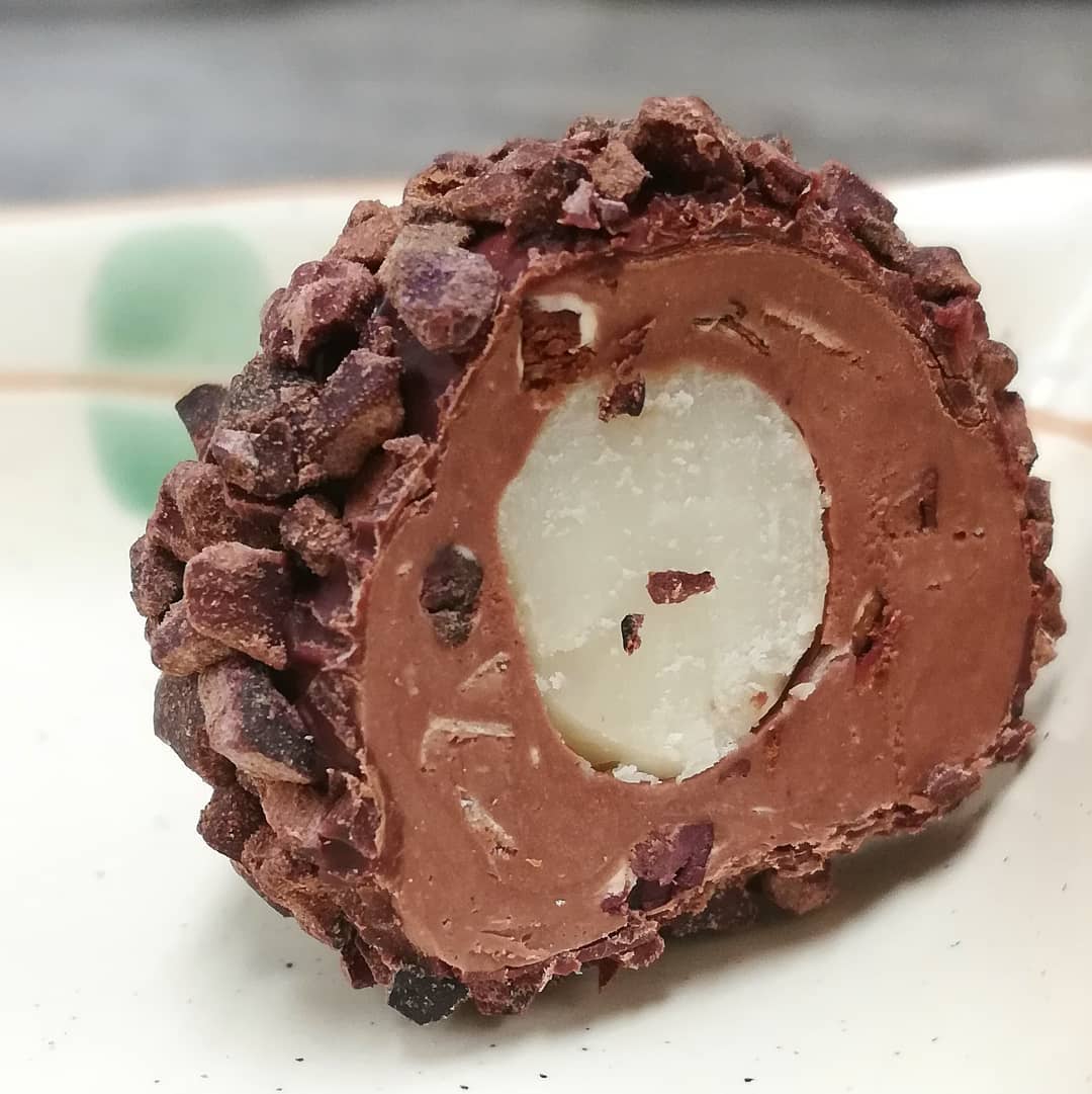 Toasted Macadamia August 19, 2020August 19, 2020What's In My Box LOOKFAR – a whole toasted macadamia surrounded with hazelnut nougat and finished in crushed cacao nibs. #chocolatier #nougat #macadamianuts Buy Boxes Buy Bars Buy Gifts Classes