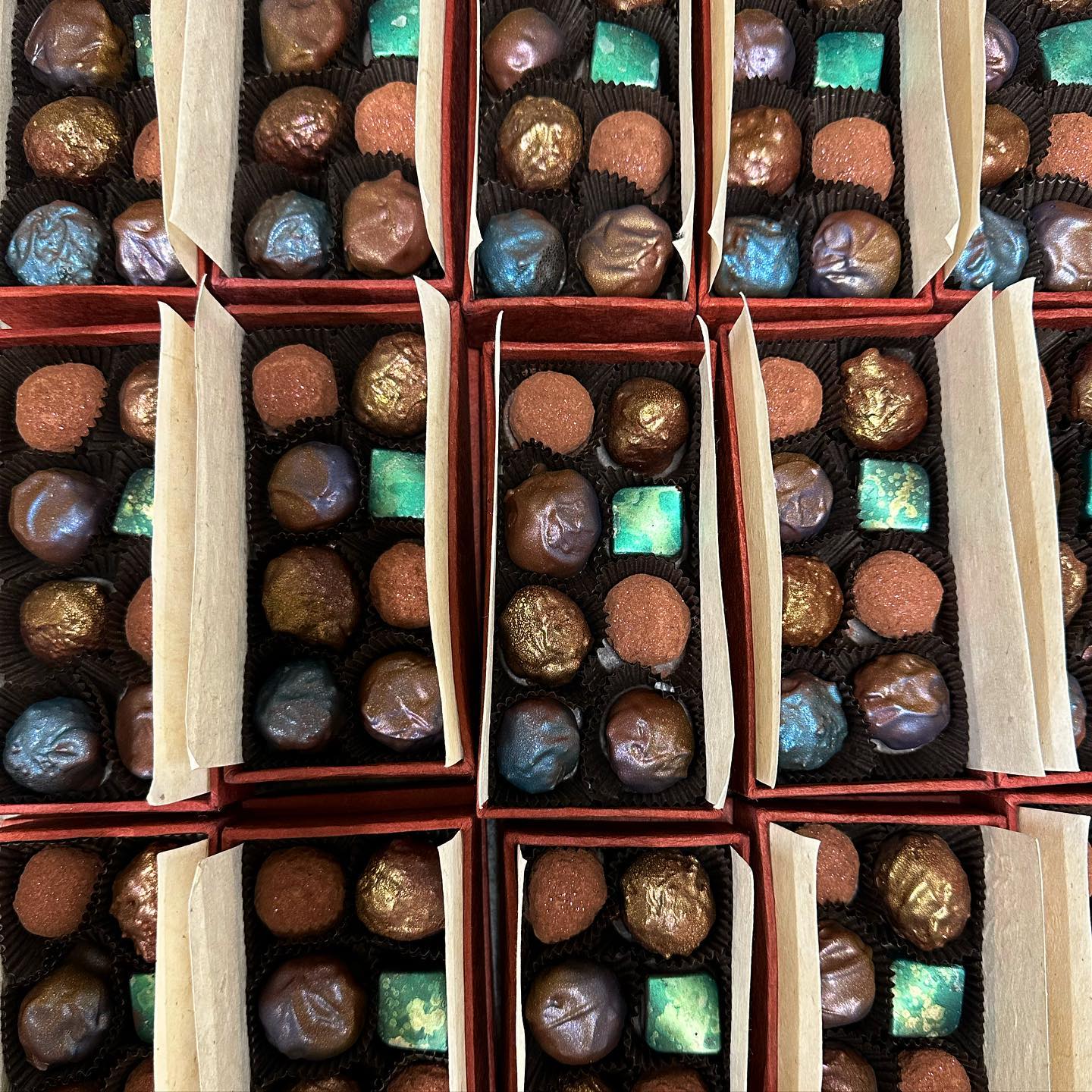 Making Truffle Boxes September 29, 2023September 30, 2023What's In My Box Making truffle boxes filled with local strawberry, mango caramel cheesecake, sweet corn and more! Available online and in our shop. #truffles #chocolatier #bonbon