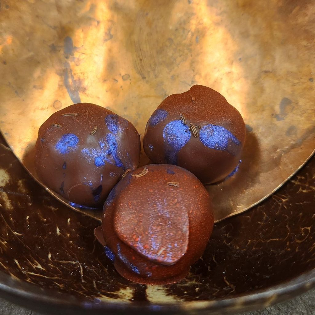Evolving Fashions • Mango and Belize BFREE Pure Criollo Heirloom chocolate ganache in Puerto Rico dark with Uzbek black cumin seeds