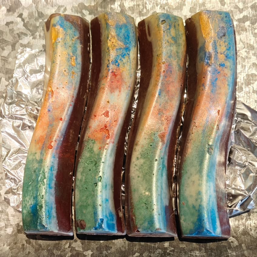 DICHROMATE – triode of pistachio gianduja, persimmon rhubarb caramel, and blood orange paté with crisp ginger sugar cast in Mexico White and Puerto Rico milk.