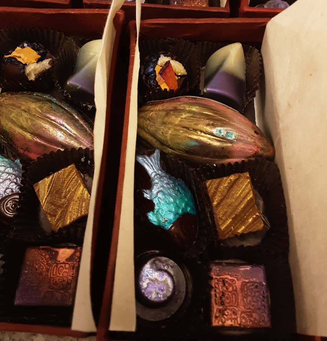 Boxes. Passion Ganache & Tea Dust Cacao Pod. December 19, 2020December 19, 2020What's In My Box MEDIUM BONBON SHARING BOXES. The LARGE BRONZE CACAO POD is Brazilian Passion Fruit ganache over tea dust ganache. #chocolatier #boxofchocolates #chocolateasart Buy Boxes Buy Bars Buy Gifts Classes