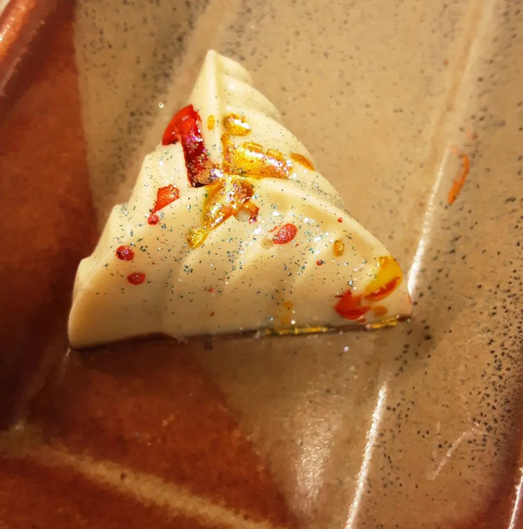 MOLÉ PRALINÉ (eh?) – pumpkin seed praliné over molé cloud caramel cast in Bolivia dark and Peru white. We made the molé with local tomatoes, heirloom chiles, and HCP no.12 Nicaragua heirloom dark chocolate.
