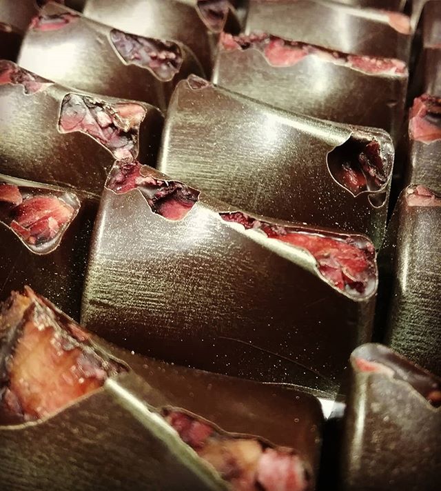 MUNEN MUSO (no thoughts, no expectations) – fresh strawberry & Cara Cara orange ganache in Manabi 70% finished with dried strawberry “chips”. The strawberries were fantastic (the ones we ate fresh before drying the rest) and the Manabi is from our friends at Conexión Chocolate in Ecuador.
