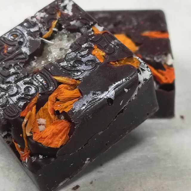 Marigolds February 11, 2020February 12, 2020What's In My Box NECTAR – marigold petals and crisp candied yuzu in dark and white chocolates. This piece is a crunch–no soft center–and the yuzu has a nice crisp chew. #chocolatier #chocolate #marigolds #yuzu Buy Boxes Buy Bars Buy Gifts Classes