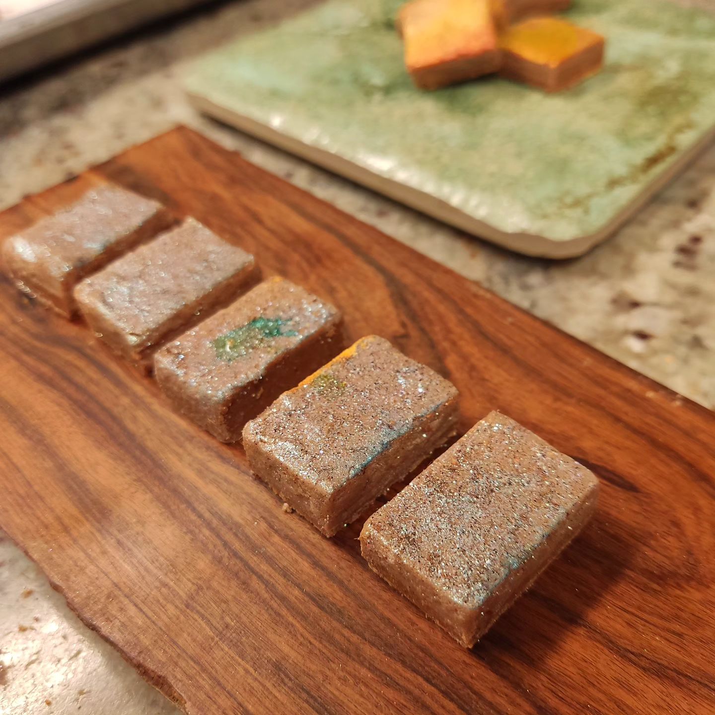 ON A TANGENT – Two cashew giandujas–Belize Pure Criollo HCP-designated Heirloom dark chocolate and Mexico Communitario sweet milk chocolate–layered and brushed with Ron Zacapa Guatemalan rum.