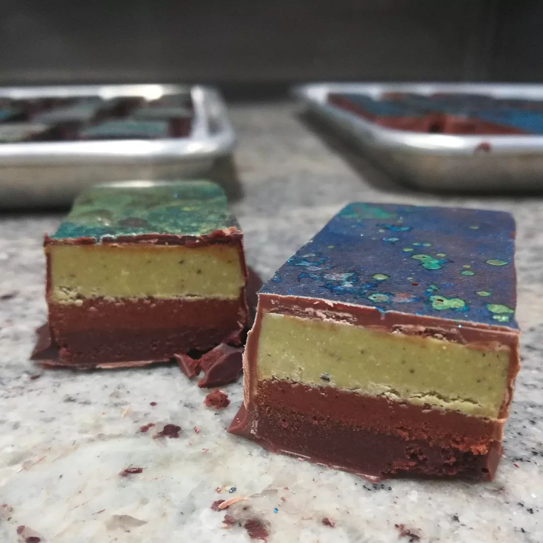 ON ONE HAND: a candy bar in two versions, both three layers, pistachio gianduja, Achiote ganache and broadleaf thyme ganache, one in caramel milk, the other Venezuela dark