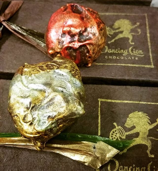 Truffles December 24, 2017December 24, 2017What's In My Box PAIR OF TRUFFLES. Blue-gold: Lemon cloud caramel in Peruvian 100%. Orange-reg: Satsuma and Woodford Reserve bourbon in Honduran 70%.