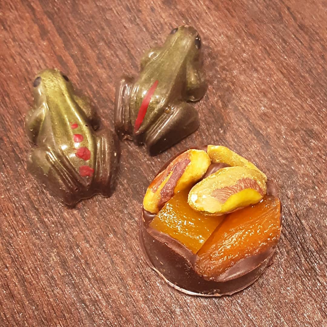 Maple Frog, Apricot Pistachio Cluster November 6, 2020November 6, 2020What's In My Box (background) PHIL IN THE FROG – Ganache of Phil’s excellent NH maple syrup cast in fruity Tanzania 72%. (Foreground) ALADDIN’S CAVE – honey-bourbon soaked apricots with pistachios. #chocolatier #newhampshire #maplesyrup #coquifrog #mixedmetaphors Buy Boxes Buy Bars Buy Gifts Classes