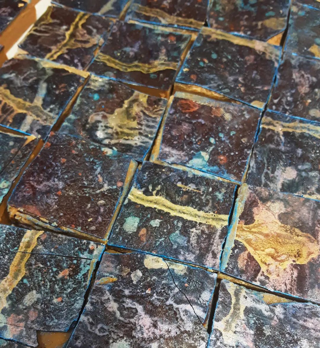 PIECES OF PATHS: pecan praliné with a topped with an painted layer of house-made Ecuador dark chocolate