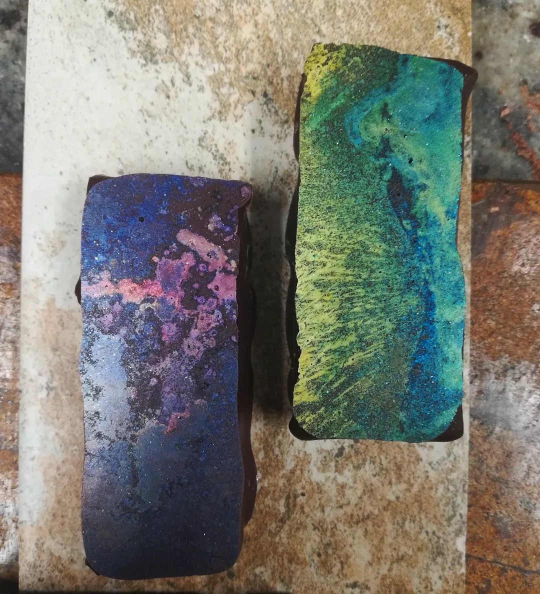 PROBABILITY: A candy bar two ways. Macadamia gianduja layered with caramelized sugar milk chocolate spiced with saffron and clove and enrobed in dark chocolates