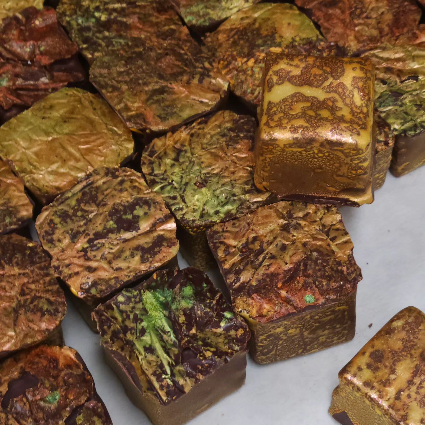 RECOUNTING SUMMER – fresh apricot ganache layered with basil ganache hand-dipped in Wild Bolivia Itenez Heirloom dark chocolate.