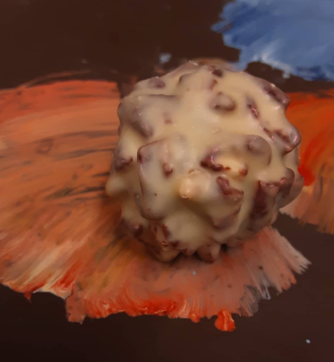 REMINISCING ON ROCKS: cranberries and white chocolate with Mexico vanilla and Cognac in two chocolates and crushed pecans