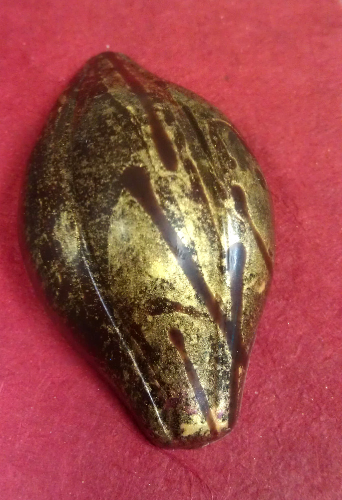 A cacao pod filled with lemon balm & Axiom dark chocolate ganache.