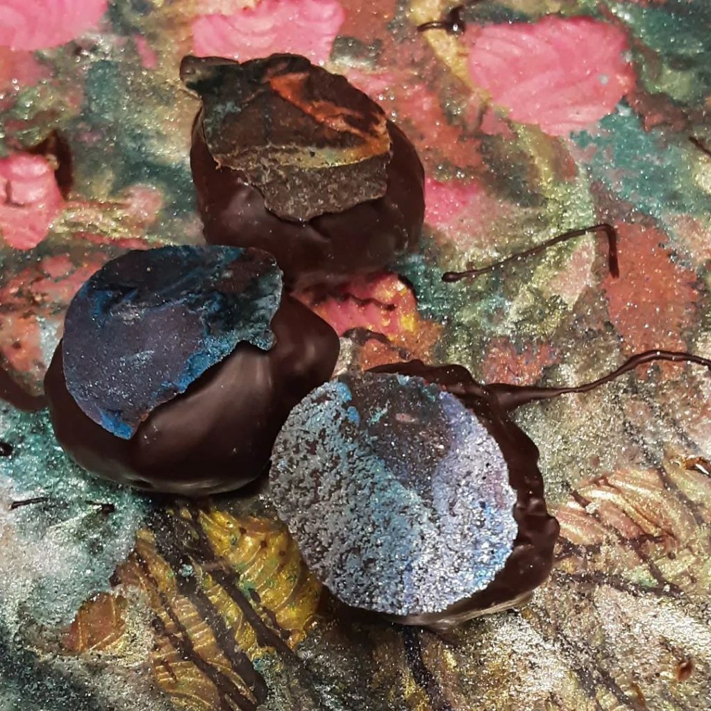 UP HILL LOOKING: Japanese Shiso leaf ganache enrobed in Wild Bolivian “Itenez” Heirloom dark chocolate