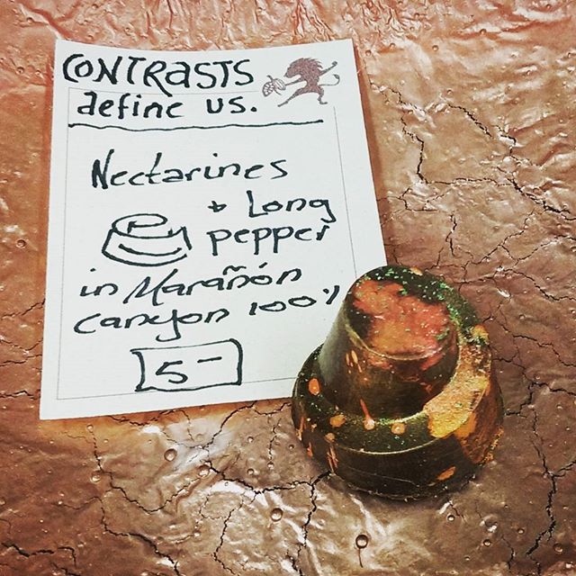 A Study in Contrasts August 20, 2017August 20, 2017What's In My Box There should be no need to say it, but CONTRASTS DEFINE US. I’ve created an unusual bonbon with several contrasting flavors and textures. Fresh nectarine confit with long pepper in Peruvian Maranon Canyon 100%.